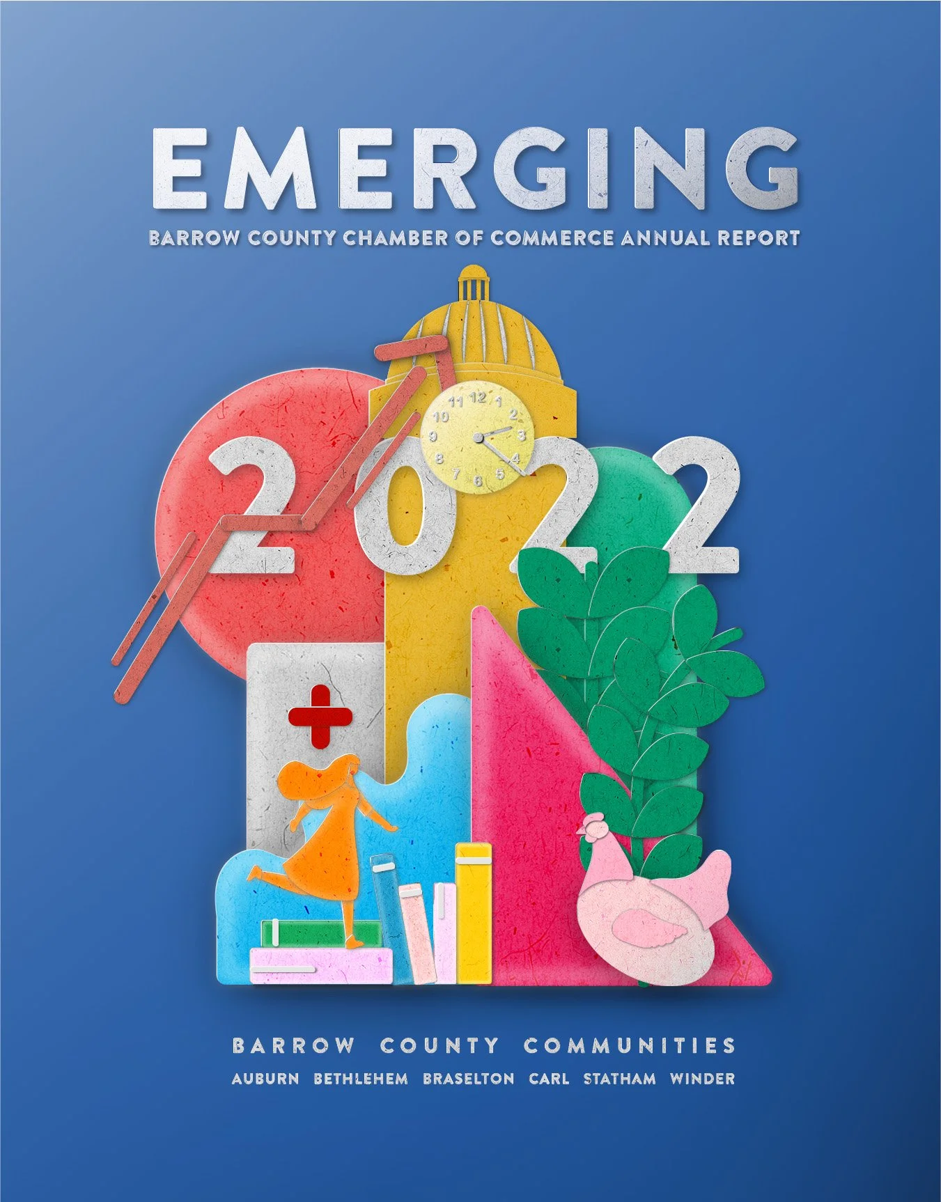 I decided to start with cover concepts. The more I learned about the Chamber and the Barrow County community, the more details I wanted to include. I also decided to incorporate a texture to represent our anchor word for the project: Emerging.